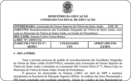 O parecer CNE/CES n.º 68/2011, homologado e publicado em julho do mesmo ano, renovou o credenciamento da instituição junto ao Ministério da Educação, reafirmando sua qualidade acadêmica.